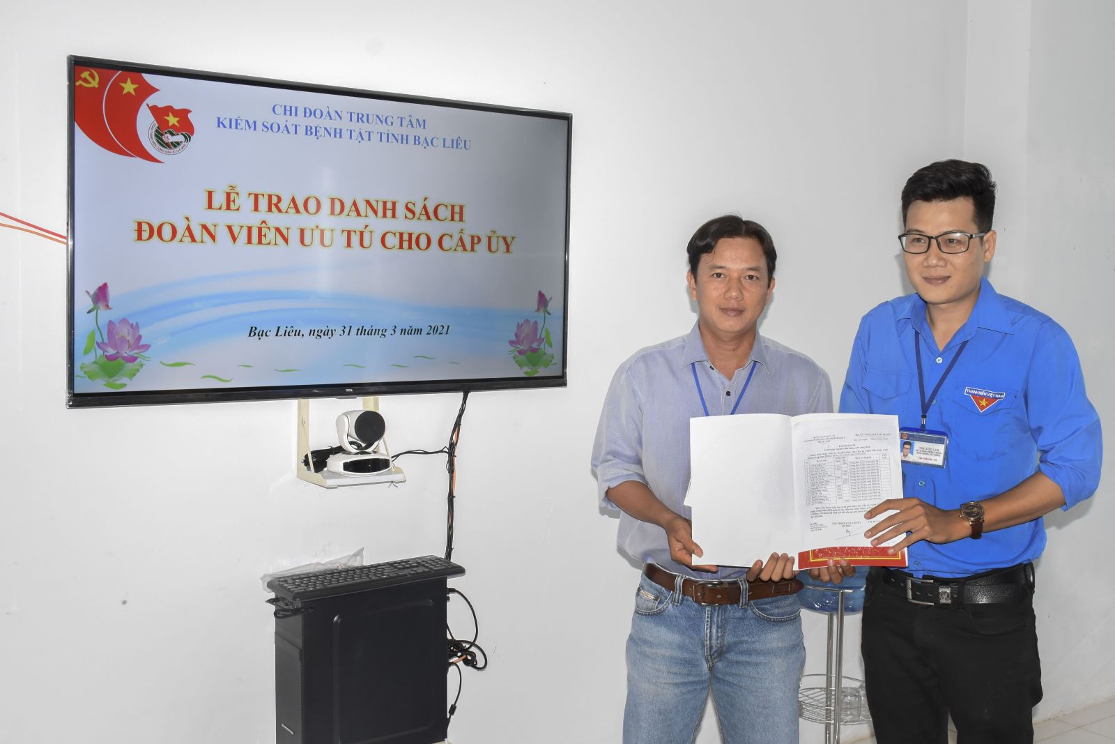 Đ/c Thái Tùng Lam, Bí thư Chi đoàn TT KSBT Bạc Liêu trao danh sách đoàn viên ưu tú cho đ/c Quách Văn Kiệm, đại diện Chi bộ TT KSBT.
