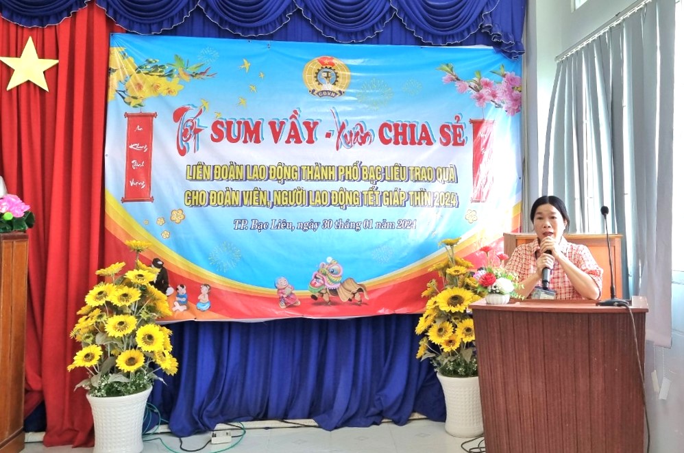 Thực hiện Kế hoạch số 01/KH-LĐLĐ, ngày 02/01/2024 của Liên đoàn lao động thành phố Bạc Liêu, Công đoàn cơ sở Trung tâm y tế thành phố Bạc Liêu tổ chức buổi họp mặt, nhằm chăm lo đời sống vật chất, tinh thần cho đoàn viên và người lao động nhân dịp Tết Nguyên đán Giáp thìn 2024 với chủ đề “Tết Sum vầy - Xuân chia sẻ ”. Chiều ngày 30/01/2024, tại buổi họp mặt "Tết sum vầy – Xuân chia sẻ”, Ông Nguyễn Thanh Bình, Phó Chủ tịch Liên đoàn Lao động Tp. Bạc Liêu đại diện trao tặng 60 suất quà cho đoàn viên, người lao động có hoàn cảnh đặc biệt khó khăn, mỗi suất trị giá 500.000 đồng. Nhận quà đợt này là những đoàn viên, người lao động có hoàn cảnh kém may mắn, khó khăn trong cuộc sống, là người có nguồn thu nhập chính trong gia đình (sống cùng và trực tiếp nuôi cha mẹ già); người mắc bệnh hiểm nghèo, bản thân là người khuyết tật hoặc bị tai nạn lao động, nuôi con nhỏ dưới 24 tháng và có thu nhập trung bình hàng tháng trong năm thấp dưới mức lương tối thiểu vùng.
