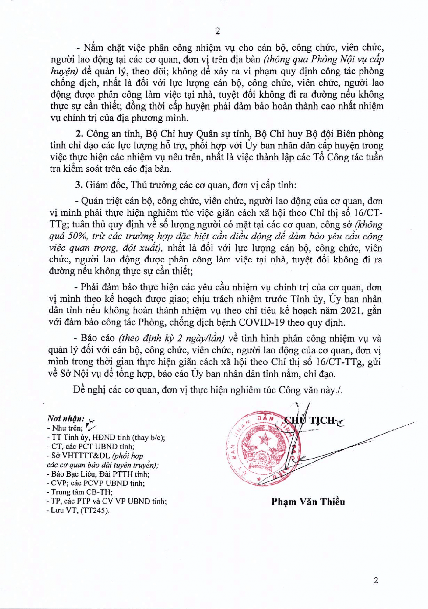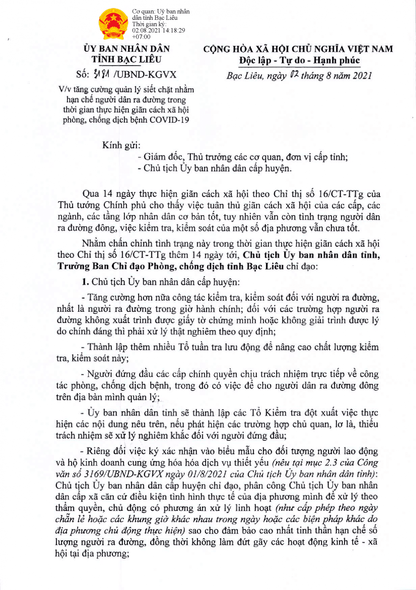 Thứ 3, 03/08/2021 | 07:36 A- A A+ | Bạc Liêu tăng cường quản lý siết chặt nhằm hạn chế người dân ra đường trong thời gian thực hiện giãn cách xã hội phòng, chống dịch bệnh Covid-19. Đọc bài Lưu Tác giả: UBND tỉnh Bạc Liêu Tổng số điểm của bài viết là: 0 trong 0 đánh giá Click để đánh giá bài viết Tin liên quan UBND tỉnh Bạc Liêu ban hành công văn số 3144/UBND-KGVX V/v thực hiện Nghị quyết số 78/NQ-CP của Chính phủ và tăng cường xử lý tin giả, tin sai sự thật về COVID-19 trên mạng. (02/08/2021) Bạc Liêu kéo dài thời gian thực hiện giãn cách xã hội theo Chỉ thị số 16/CT-TTg của Thủ tướng Chính phủ thêm 14 ngày trên phạm vi toàn tỉnh từ 00 giờ ngày 02/8/2021. (01/08/2021) Công điện của Thủ tướng Chính phủ về phòng, chống dịch COVID-19. (31/07/2021) Tỉnh Bạc Liêu kéo dài thời gian thực hiện giãn cách xã hội theo Chỉ thị số 16/CT-TTg của Thủ tướng Chính phủ trên phạm vi toàn tỉnh từ 00 giờ ngày 02/8/2021. (31/07/2021) Infographic "Thông tin cần biết về vắc xin phòng COVID-19 Moderna" được xây dựng theo Sổ tay Hướng dẫn thực hành tiêm chủng vắc xin phòng COVID-19 MODERNA. (30/07/2021) SỔ TAY SỨC KHỎE COVID-19 DO TRƯỜNG ĐẠI HỌC Y DƯỢC TP. HCM BIÊN SOẠN (30/07/2021) Thông điệp truyền thông: Hướng dẫn theo dõi sau tiêm chủng vắc xin phòng Covid-19. (28/07/2021) Infographic về Phân loại các nhóm đối tượng trong khám sàng lọc trước tiêm vắc xin phòng COVID-19 (theo Quyết định 2995/QĐ-BYT ngày 18/6/2021 của Bộ Y tế) và Mẫu Phiếu khám sàng lọc trước tiêm (Tại Quyết định 3445/QĐ-BYT ngày 15/7/2021 của Bộ Y tế). (27/07/2021) UBND tỉnh Bạc Liêu ban hành công văn số 3030/UBND-KGVX ngày 26/7/2021 V/v chấn chỉnh, quản lý chặt chẽ không cho người dân ra đường khi không thật sự thật cần thiết nhằm đảm bảo tinh thần giãn cách xã hội theo Chỉ thị 16/CT-TTg về phòng chống COVID-19. (26/07/2021) Hướng dẫn thực hiện test nhanh mẫu gộp phát hiện kháng nguyên SARS-CoV-2 nhằm sàng lọc các ca dương tính tại cộng đồng (25/07/2021) Thư ngỏ của Trưởng Bộ phận thường trực đặc biệt của Bộ Y tế tại TP.HCM, Thứ trưởng Bộ Y tế Nguyễn Trường Sơn gửi đến các đồng nghiệp hoạt động trong lĩnh vực Y tế tại TP.HCM và các tỉnh gần, xa. (25/07/2021) Bạc Liêu giảm thời gian cách ly, cho cách ly y tế tại nhà, tại các cơ sở lưu trú, khách sạn trên địa bàn tỉnh đối với một số trường hợp (24/07/2021)