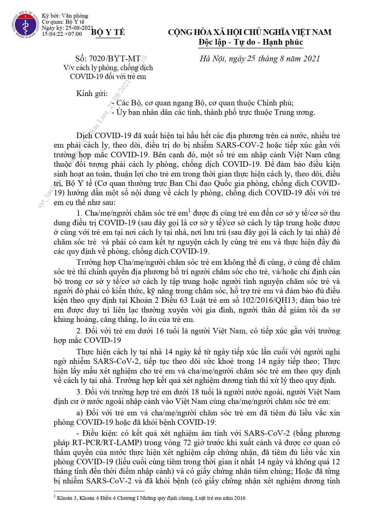 Thứ 5, 26/08/2021 | 08:36 A- A A+ | Công văn 7020/BYT-MT ngày 25/8/2021 của Bộ Y tế: Về việc cách ly, phòng chống dịch COVID-19 đối với trẻ em. Đọc bài Lưu Tác giả: Nguồn: Bộ Y tế Tổng số điểm của bài viết là: 5 trong 1 đánh giá Click để đánh giá bài viết Tin liên quan Bạc Liêu: Kết thúc thời gian thiết lập vùng cách ly y tế tại ấp Vĩnh Bình A, xã Vĩnh Thanh, huyện Phước Long. (26/08/2021) Bạc Liêu: Dời thời gian đón công dân tỉnh Bạc Liêu trở về địa phương. (23/08/2021) Bạc Liêu: Cho phép người dân đi chợ mua thực phẩm trong thời gian thực hiện các biện pháp khẩn cấp phòng, chống dịch COVID-19 trên địa bàn tỉnh (áp dụng từ 03 giờ ngày 23/8/2021 đến khi có thông báo mới). (23/08/2021) Bạc Liêu: Thực hiện khẩn cấp các biện pháp phòng, chống dịch COVID-19 trên địa bàn tỉnh (áp dụng từ 03 giờ sáng ngày 23 tháng 8 năm 2021). (23/08/2021) Công văn của UBND tỉnh Bạc Liêu: Về việc bổ sung, làm rõ thêm một số nội dung thực hiện các biện pháp giãn cách xã hội theo Chỉ thị số 15/CTTTg trên địa bàn tỉnh Bạc Liêu (theo Quyết định số 1366/QĐ-UBND ngày 21/8/2011 của Chủ tịch UBND tỉnh). (22/08/2021) Hiểu đúng về: Phong toả, Giãn cách xã hội, Cách ly y tế. (22/08/2021) Bạc Liêu: Thiết lập vùng cách ly y tế để phòng, chống dịch COVID-19 thuộc địa bàn ấp Vĩnh Mới, xã Vĩnh Thịnh, huyện Hoà Bình. (22/08/2021) Bạc Liêu: Áp dụng giãn cách xã hội theo Chỉ thị số 15/CT-TTg của Thủ tướng Chính phủ trong 14 ngày, kể từ ngày 23/8/2021 đến hết ngày 05/9/2021. (21/08/2021) NHỮNG THÓI QUEN CẦN THAY ĐỔI TRONG MÙA DỊCH. (21/08/2021) Bạc Liêu: Triển khai xét nghiệm diện rộng để chủ động phòng, chống dịch bệnh COVID-19 trên địa bàn tỉnh. (19/08/2021) Bạc Liêu: Thiết lập và bảo vệ “vùng xanh” trong phòng, chống dịch COVID-19 trên địa bàn tỉnh. (19/08/2021) Bạc Liêu: Công bố hoạt động Cổng Thông tin Phòng, chống dịch COVID-19 tỉnh Bạc Liêu. (19/08/2021)